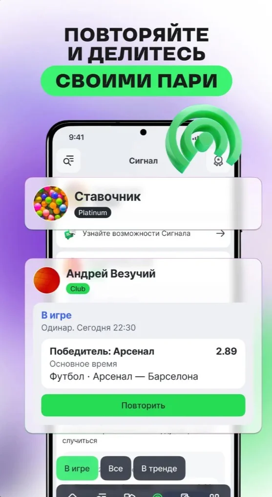- «Сигнал» - новая функция букмекера, в которой вы можете показывать другим игрокам свои ставки или смотреть за пари остальных пользователей.