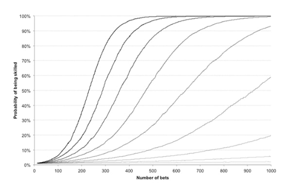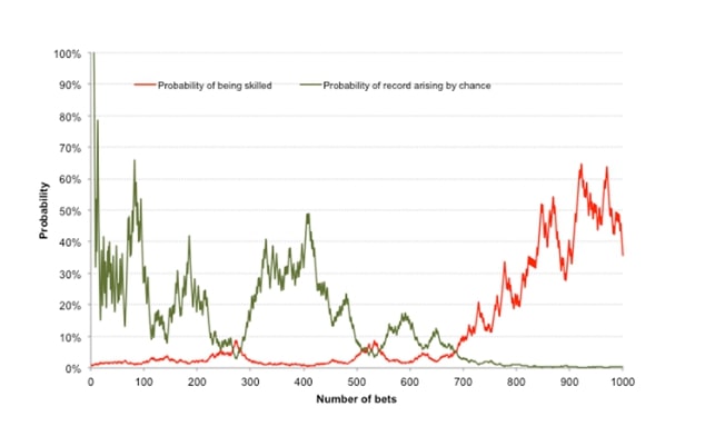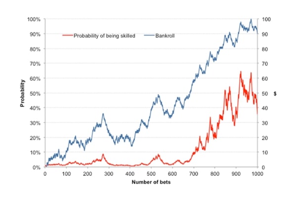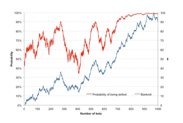 Для получения более ясного представления о потенциальном мастерстве игрока на ставках хорошо подходит моделирование по методу Монте-Карло. График ниже демонстрирует результаты изменения значений байесовской вероятности предполагаемой опытности после серии из 1 000 пари. В основе здесь лежит расчет медианных показателей после каждого последовательного пари.