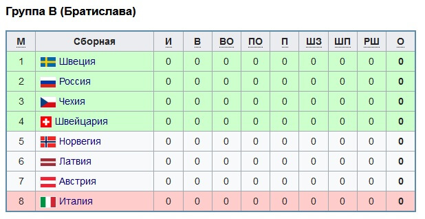 Группа B на этот раз наполнена командами Швеции, России, Чехии, Швейцарии, Норвегии, Латвии, Австрии и Италии.