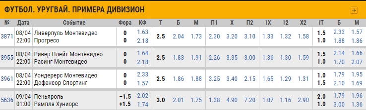 Как видно из цифр, уругвайский чемпионат очень зрелищный и результативный, ставки с «верхом» тотала встречаются очень часто. Букмекеры не занижают коэффициенты на такой исход, поэтому в линиях большинства контор такую ставку можно найти в среднем с коэффициентом 1.93.