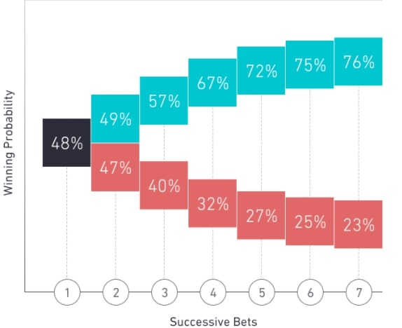 Исследователи обратили внимание, что с каждой последующей победой сильно увеличивается возможность успешного исхода следующего пари. Так, при трех выигрышах вероятность победы четвертой ставки составила 0.67. Что касается обратного значения, то здесь наметилась интересная закономерность - при любом прерывании серии побед, ваш шанс выиграть в следующий раз будет составлять 0.45.