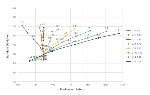 В подобных условиях контора бы стала завышать котировки на фаворита и занижать на аутсайдера. Новая диаграмма показывает ожидаемый доход и стандартное отклонение в случае разнообразного распределения маржи букмекера.