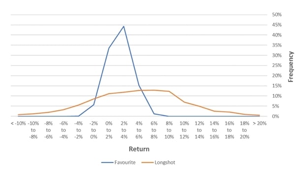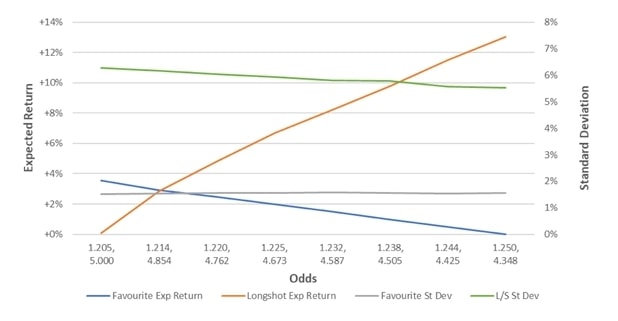 Мы смоделировали ситуацию при серии из 1 000 пари на обе стороны противостояния и повторили каждую серию 5 000 раз для расчета стандартного отклонения доходности. При заключении пари на фаворита этот показатель составил 1.5%, а при ставках на слабую сторону 6.2%. Ясное дело, что в такой ситуации контора бы предпочла ставки на сильную сторону, ведь в этом случае риски были бы гораздо ниже.