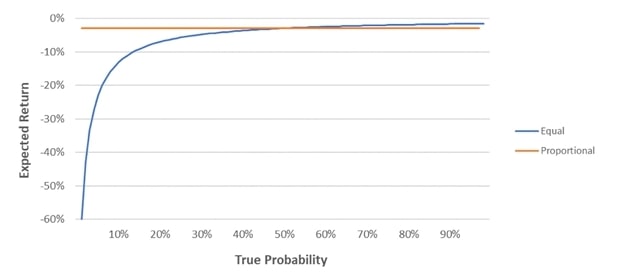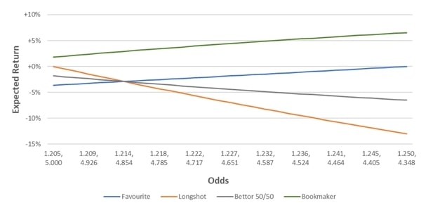 Становится очевидным, что при пропорциональном распределении маржи на каждую сторону рынка эффекта предвзятости не возникнет. А вот при равномерном распределении это проявится в сильной степени. Иными словами, чем ниже предполагаемая вероятность успеха - тем ниже ожидаемая доходность. Поэтому и нужно иметь представление о том, как именно букмекер распределяет собственную маржу.