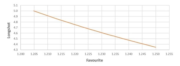 Представим, что контора имеет оптимальные навыки прогнозирования и умеет оценивать реальные шансы сторон на выигрыш. Допустим, что букмекер распределил эти вероятности, как 20% для одной команды и 80% для другой. Учитывая это, честные котировки выглядели бы, как: 1 / 0.2 = 5.0 и 1 / 0.8 = 1.25. Теперь предположим, что маржа конторы составит 3% и конечные котировки должны попадать в диапазоны между 5.0, 1.205 (вся маржа на фаворита) и 4.35, 1.25 (вся маржа на аутсайдера). График ниже показывает, где именно должны расположиться значения коэффициентов.