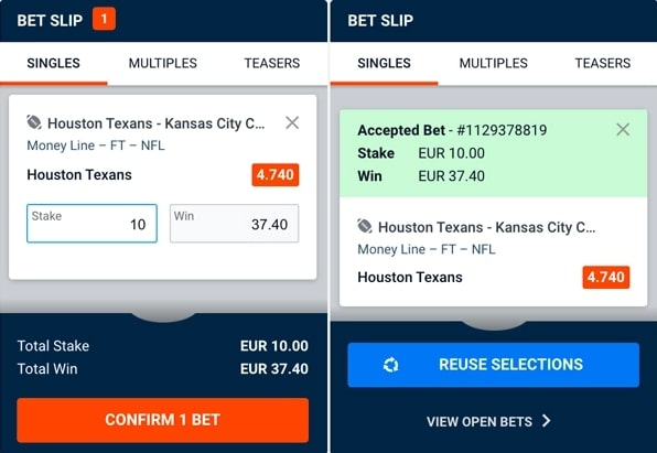 В случае победы Houston Texans вы получите прибыль в размере 37.40 евро при ставке в 10 евро. Однако при выигрыше Kansas City Chiefs ваше пари окажется проигранным и вы лишитесь своих 10 евро.