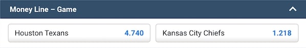 Котировки в примере помогают сделать предположение, что вероятность выигрыша Kansas City Chiefs составляет 79.56%. Победа противника (Houston Texans) оценивается значением в 20.44%. При уверенности, что успех второй стороны противостояния выше этой величины, вы можете поставить на ее выигрыш, отметив это в купоне.