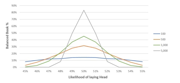 Отсюда становится очевидным, что шансы букмекера сбалансировать счет возрастают по мере увеличения количества ставок, которые он собрал. Также выянсянется, что конторе с более низким уровнем собственной маржи сложнее сбалансировать счет, чем более предприимчивому конкуренту.
