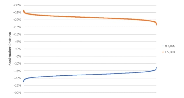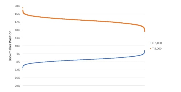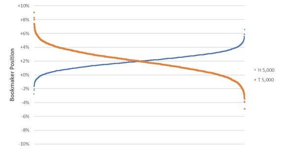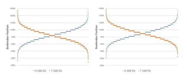 Далее сотня непрофессиональных игроков намереваются заключить пари на одинаковые суммы. Они не знают о реальной вероятности и исходят из шансов 50 на 50. Попытаемся представить модель, как это будет выглядеть для букмекера при 5 000 повторениях. Диаграмма ниже демонстрирует диапазон положений до подбрасывания монеты. Левее данные для конторы с 2% маржи, в правее - для 5%.