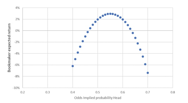 Выбор котировок находится в зависимости от склонности конторы к риску. Диаграмма ниже демонстрирует предполагаемый доход букмекера для разных вероятностей, которые подразумевается избранными коэффициентами.