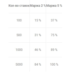При отклонении принятых пари от фактической подразумеваемой вероятности шанс букмекера сбалансировать счет стремительно уменьшается. Отсюда делаем вывод, что контора с маржой в 2% имеет значительно меньше вариантов для подобного маневра уже после 1 000 ставок от игроков.