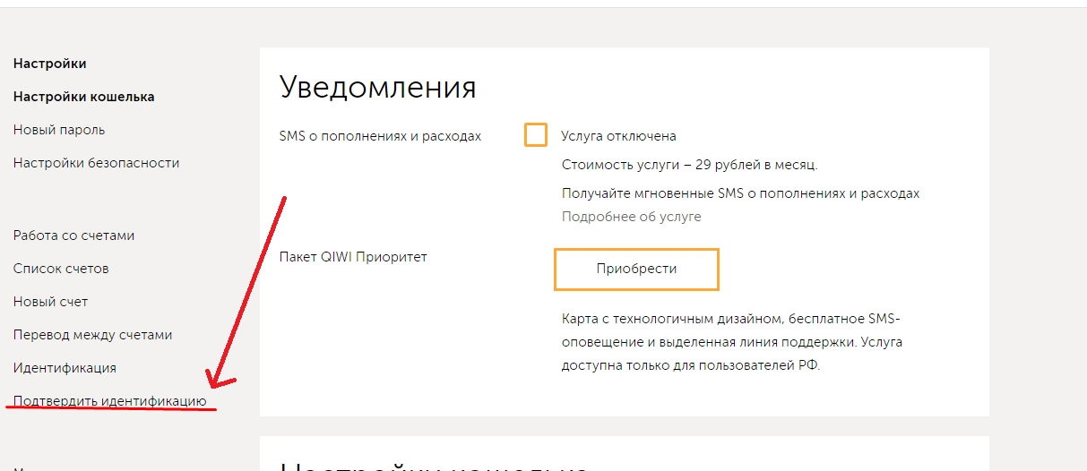 Чтобы подтвердить идентификацию, необходимо в настройках кошелька найти вкладку «Подтверждение идентификации» и кликнуть по этому разделу:
