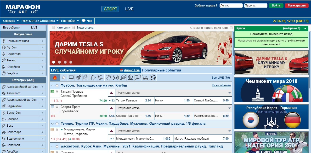 При переходе на сайт букмекерской конторы Марафон откроется главная страница: