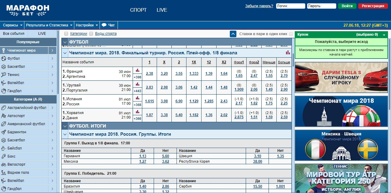 Чемпионат Мира в самом разгаре, сборная России хоть и проиграла последний матч Уругваю, но из группы выйти смогла. Теперь россияне померяются силами с одной из сильнейших сборных в мире, сборной Испании. В такой ответственный момент наверняка многие захотят поставить на проход сборной России, ведь букмекеры предлагают очень щедрый коэффициент на их победу. Но как же быть, если опыта игры в букмекерской конторе нет? Рассмотрим весь процесс регистрации в деталях на примере одной из самых популярных букмекерских контор в России – БК Марафон