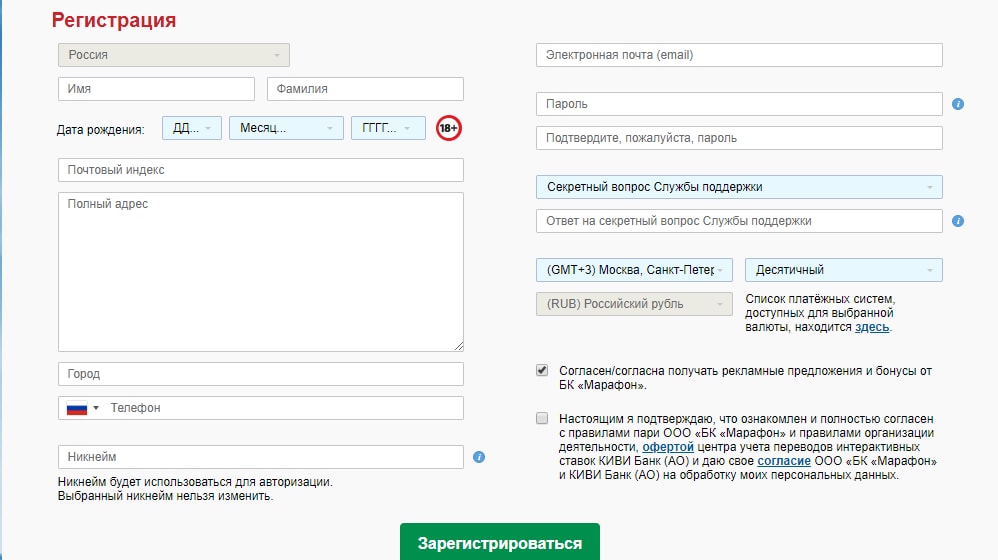 В анкету необходимо внести личные данные, также букмекер потребует ввести номер телефона и адрес электронной почты. Клиенту также нужно будет придумать свой логин и пароль. После выполнения этих требований нужно будет ознакомиться с правилами букмекера и подтвердить свое согласие с ними. Завершается регистрация на сайте БК Марафон путем клика по значку «Зарегистрироваться».
