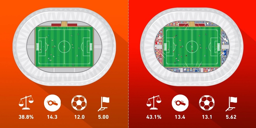 Взглянув на данные матчей более пристально, можно заметить интересные вещи. Как уже отмечалось, исследования свидетельствуют о непропорционально низком количестве фолов со стороны хозяев. Как показывают свежие данные, фолы, за которые судьи наказывали хозяев, увеличились с 13,4 в присутствии зрителей до 14,3 при пустых трибунах.