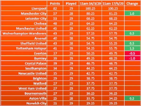 На Рисунке ниже показано сравнение итоговых результатов для команд Премьер-лиги, сначала на 14 марта (непосредственно перед прерыванием сезона) и затем на 17 июня (непосредственно перед возобновлением):