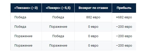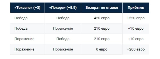 Для упрощения задачи примем за факт, что контора назначила на форы «Хьюстон Тексанс» (-3) и «Грин-Бей Пэкерс» (-5.5) котировки 2.10 для каждого события. Мы имеем 47%-ную вероятность того, что наши два пари выиграют, однако допустим, что ваши расчеты показывают это значение на уровне 50%. Ниже приведен пример расчета ваших сумм ставок по 100 евро для каждого варианта (в общей сложности 200 евро).