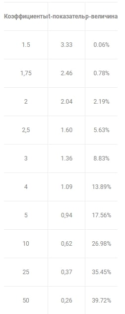 Таблица ниже показывает несколько вариантов Т-показателей и р-величин, которые им соответствуют, при выборке в 100 пари и выигрышем в 120%.
