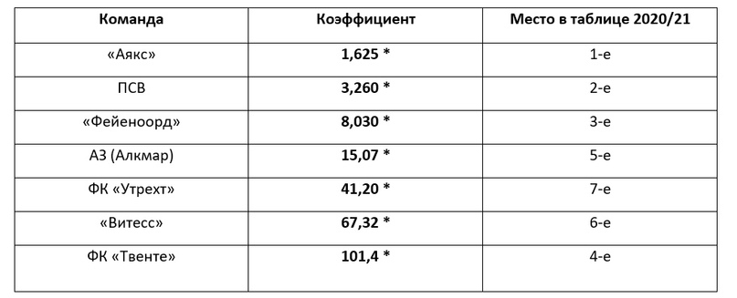 А в последнем сезоне за звание чемпиона боролись почти равные по силе соперники. Всего два очка разделяли «Аякс» и ПСВ. Последний может получить шанс покончить с доминированием «Аякс» в Эредивизи, ведь он укрепил свою команду. А вот «Аякс» лишилась ключевых игроков последнего сезона. Тем не менее благодаря трансферам сильных игроков шансы «Аякс» на завоевание четвертого титула в лиге подряд существенно возросли. Сейчас коэффициент команды составляет 1,62. Она остается фаворитом на звание чемпиона по итогам сезона.