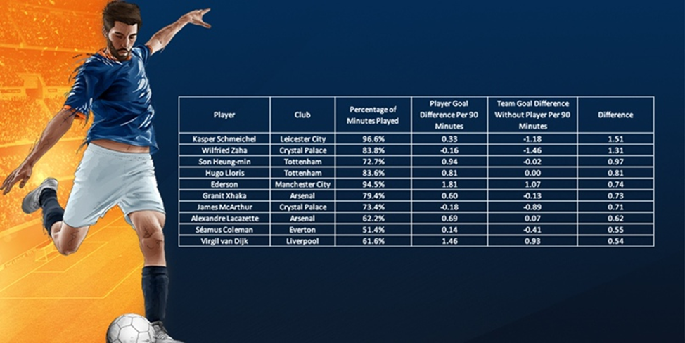 Так, показатели Каспера Шмейхеля подчеркивают сложность проведения анализа подобного типа. Если такой игрок выходит на поле практически в каждой игре, то выборка из матчей без его участия будет слишком малой для получения полезных данных. Но полностью игнорировать такие случаи нельзя. Куда больший интерес представляют показатели трех нижних игроков. Количество сыгранных ими минут находится в диапазоне между половиной и двумя третями доступного времени, а их команды улучшали свой результат примерно на 0,5 гола за матч, когда эти футболисты участвовали в игре.