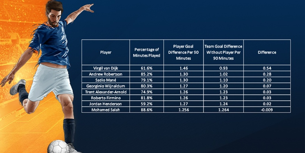 С помощью применяемого метода сравнения выясняется, что Мохамед Салах является наименее важным игроком из восьми представленных в исследовании футболистов «красных».