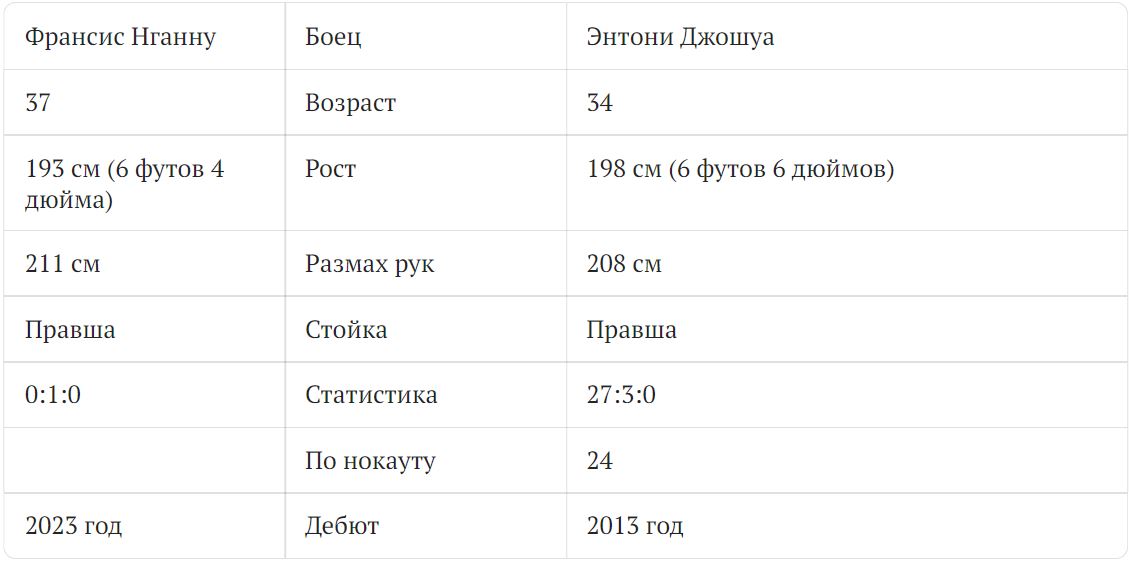 Так выглядит сравнительная характеристика боя Франсис Нганну против Энтони Джошуа
