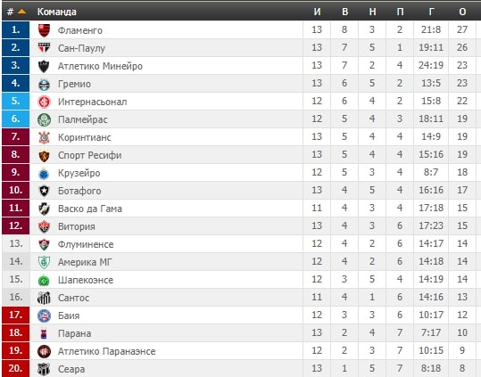 Отмечаем, в первую очередь, невероятную мощь «Фламенго», который удерживает лидерство на протяжении большей части чемпионата. Также есть смысл обратить внимание на позицию «Коринтианса», действующего чемпиона Бразилии. «Тимау», по всей видимости, чересчур выложились в Кубке Либертадорес, не оставив сил на чемпионат. Также огромным разочарованием для болельщиков является нынешний сезон в исполнении «Сантоса», балансирующего по краю зоны вылета.