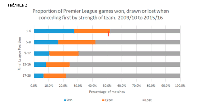 Самым выгодным для беттеров, как следует из этой таблицы, была бы ставка на команды из второй по силе группы, которые проиграли, несмотря на то, что открыли счет: расхождение между оценками букмекера и реальными результатами здесь оставило максимальные 5,9%.