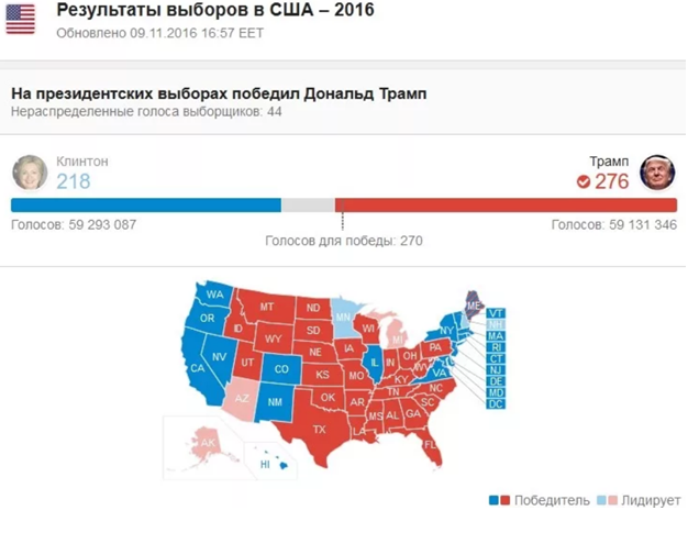 За несколько дней до выборов шансы Трампа расценивались уже гораздо выше (примерно в 17%), но все равно Клинтон оставалась безусловным фаворитом. Однако в итоге действующая сложная выборная система в США обеспечила победу Трампа. Несмотря на то, что большинство проголосовавших граждан (правда, с минимальным перевесом) предпочли кандидатуру Хиллари, все решили голоса выборщиков от штатов. Вот как они в итоге распределились: