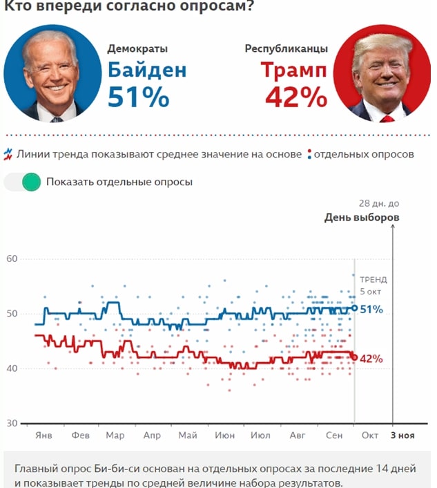 Впрочем, этот период был недолгим. Уже к концу августа шансы Трампа вновь стали увеличиваться, пока не достигли нынешних значений. Оценкам букмекеров приблизительно соответствуют и опросы общественного мнения, регулярно проводимые BBC: