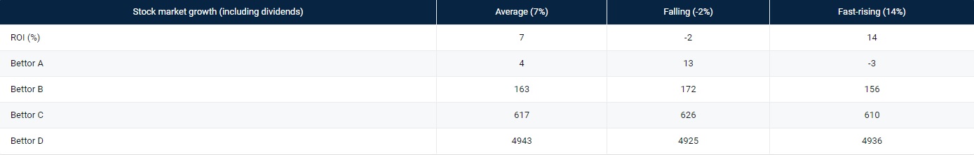 Полученные результаты были ошеломительными. Несмотря на то, что треть ставок несла в себе отрицательное математическое ожидание, связанные с размещением ставок по критерию Келли риски остались практически неизменными. Говоря в общем, это означает, что пока вы можете точно представлять величину вашего преимущества в среднем, вам совершенно необязательно знать ее для каждой ставки отдельно. Результаты отражены в Таблице 3: