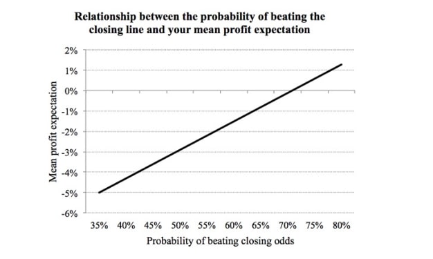 Котировки на события наиболее точно отражают суть происходящего именно перед закрытием линии. Этот факт приводит к тому, что в такие моменты игроки на ставках могут найти и воспользоваться истинными коэффициентами, которые реально могут принести прибыль. Например, если компания Пиннакл дает перед закрытием коэффициент 2.00 на событие, то оно случится с вероятностью в 50% (без учета маржи). Таким образом можно с высокой долей надежности измерить вероятность получения прибыли. При ставке на котировки 2.20 и закрытии линии по этому событию с 2.00, этот показатель можно высчитать: 2.2 / 2.0 = 1.1 или 10% (не учитывая маржу букмекера).