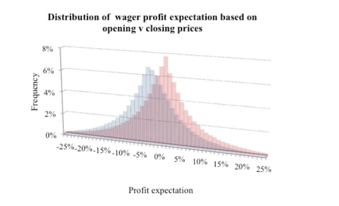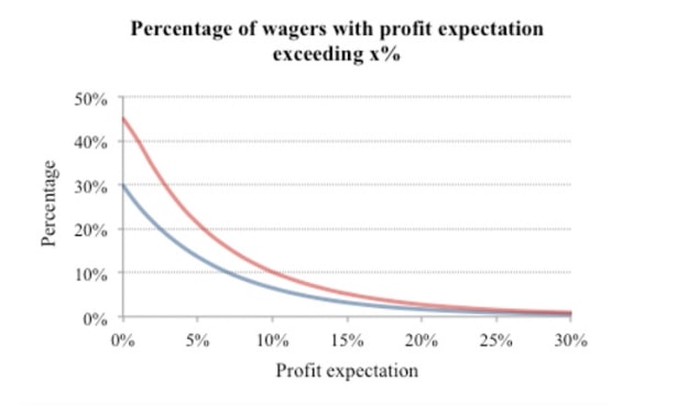 Из графика становится очевидным, что теоретических возможностей положительного математического ожидания не так уж и много. Лишь 6.5% случаев стартовых котировок предполагают возможность получения прибыли в 10% и выше. А прибыль в 20% и больше могут обеспечить лишь 2% из этих коэффициентов. Самоуверенность игроков на ставках часто приводит к тому, что они ошибочно считают, будто могут всегда отыскать выгодные котировки в линии.
