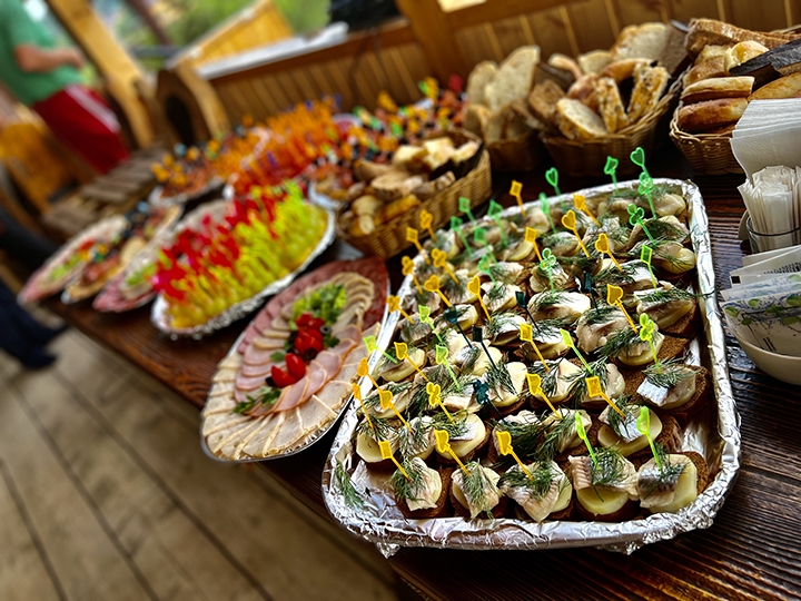 Наконец, после недолгих приветственных речей и общего фото все переместились в специально подготовленные шатры неподалёку от ресторана. Там уже были расставлены доски, на значительной части которых красовался белый барс: татарстанцы подготовились. А те игроки, чьи партии были ещё впереди, могли либо поиграть для души (некоторые начали это делать ещё до открытия), либо перекусить. На террасе ресторана всех ждал фуршет.