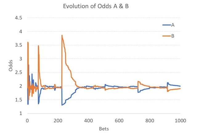 На графике ниже временные ряды демонстрируют изменение котировок на команды «А» и «В» в случае «затравки» в 1 единицу для каждой из сторон и отсутствии ставок от профессиональных игроков. Стоит учесть, что любое крупное вливание резко изменило бы существующие данные, поэтому мы и применили определенные ограничения. Становится очевидным, что проблема находится либо в величине «затравки», либо в ограничении ставок.