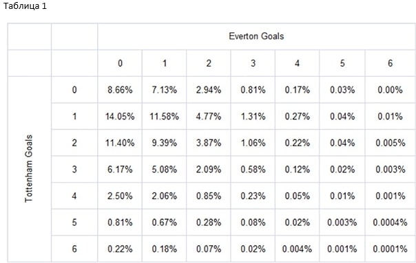 С учетом этих предполагаемых средних значений и применяя распределение Пуассона, можно вычислить процентную вероятность каждого результата матча, что отражено в Таблице 1.