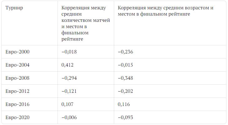 Используя коэффициент ранговой корреляции Спирмена, мы сможем сравнить эти данные с занятыми местами и определить, существует ли взаимосвязь между различными показателями. Проведение этих сравнений для предыдущих шести чемпионатов Евро показывает, что корреляции зачастую вовсе не наблюдается, а иногда зависимость и вовсе оказывается обратной. Другими словами, команда может преуспеть с большей вероятностью, если она состоит из молодых игроков, которые участвовали в малом количестве матчей.