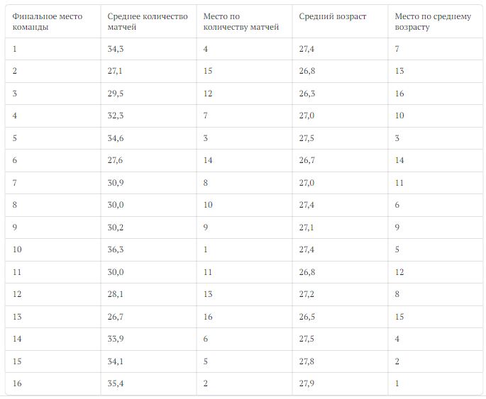 Помня об этих данных, мы можем распределить количество игр для одного игрока в зависимости от среднего возраста и получить достаточно упрощенную метрику опытности. Пусть это и не создаст сильную корреляцию между занимаемыми на турнирах местами, но в пяти из шести последних турниров Евро команды с более высоким показателем этой метрики выигрывали в финалах.