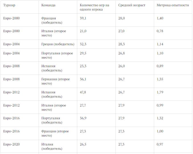 Стаж для команд-победительниц (Франция, Греция, Испания, которая выиграла дважды, Португалия и Италия) насчитывает примерно 34,3 международных матча на игрока, а средний возраст их футболистов составляет 27,4 года на момент начала участия в турнире. Среди мест с 1-е по 16-е эти показатели представляют четвертое по величине количество игр и седьмой по старшинству возраст игроков ― выглядит так, будто возраст и опыт действительно имеют значение в рамках Чемпионата Европы.