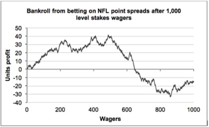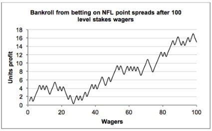 Здесь мы подходим к теме спортивных ставок и сталкиваемся с тем, что игроки тоже подвержены ошибкам по закону малых чисел, выявляя закономерности при прогнозировании. В долгосрочной перспективе неправильная оценка рентабельности может привести вас к серьезным финансовым потерям или даже к банкротству. Ниже представлен график гипотетической рентабельности 100 пари на разницу в счете в матчах NFL при постоянных котировках в размере 1.95.