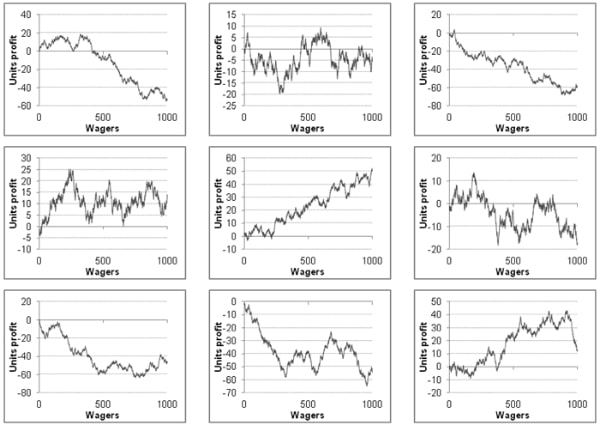 Довольно впечатляющее зрелище, не правда ли? Вы будете удивлены еще больше, если узнаете, что данный график был построен на основе ставок популярного в США гандикапера? Однако при выборке в 1000 ставок данные уже не такие радужные и больше похожи на реальность.