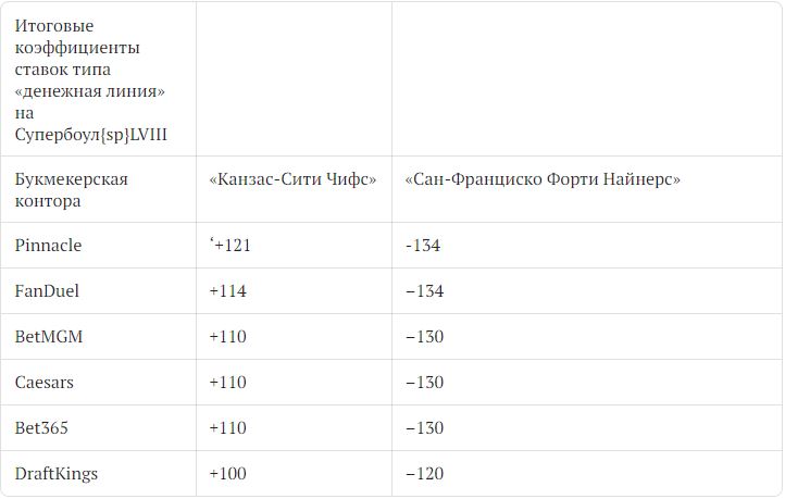 Для дальнейшего объяснения давайте посмотрим на итоговые коэффициенты ставок типа «денежная линия» на Супербоул LVIII.
