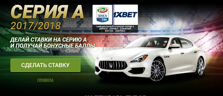 Делайте ставки на события чемпионата Италии по футболу Серия А 2017/2018 (сумма ставки должна превышать 500 RUB.) Получайте лотерейные билеты с 17.09.2017 до 20.05.2018 года. В конце каждого тура участвуйте в розыгрыше призового фонда в размере 500 000 бонусных баллов. Принимайте участие в розыгрыше суперприза - автомобиля Maserati Quattroporte S - и других призов 22.05.2018 18:00!