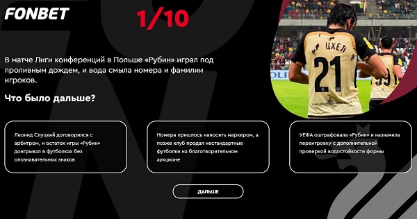 Ты в курсе, что Александр Коларов был в шаге от перехода во владивостокский «Луч», а Златан забивает голы в каждом из 26 сезонов на высоком уровне? Помнишь, как именно Месси дебютировал за ПСЖ и что сказал Карпин после первого матча во главе сборной? Знаешь о футболе всё? Проверь себя и получи бонус от Фонбет!