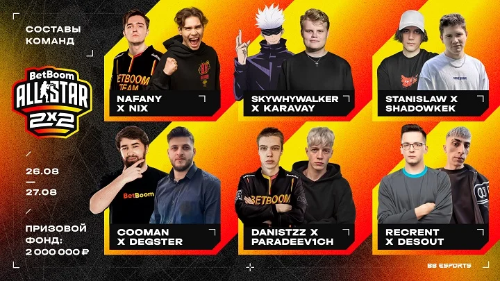 26-27 августа пройдет турнир по CS:GO BetBoom All-Star 2x2 с призовым фондом 2 миллиона рублей! Участие примут 6 команд. В составах – PRO-игроки и топовые стримеры: