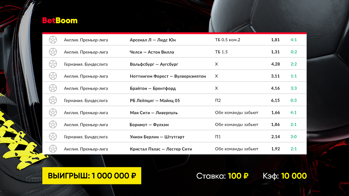 Один из клиентов BetBoom собрал экспресс из футбольных матчей Российской премьер-лиги. Ставя только на победу хозяев, он успешно предсказал исходы пяти из восьми матчей последнего тура, что принесло ему выигрыш в размере почти 2 миллионов рублей при ставке в 115 846 рублей и коэффициенте 15.83. Этот клиент показал, что правильно выбранные стратегия и прогнозы могут привести к значительным денежным призам.