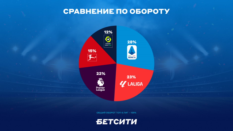 В БЕТСИТИ сравнили топ-5 лиг между собой по обороту ставок. Серия А стала лидером по популярности среди всех чемпионатов, перехватив лидерство у РПЛ. На чемпионат Италии пришлось 28% ставок. Следом идут Примера (23%) и АПЛ (22%). От тройки лидеров значительно отстают Бундеслига (15%) и Лига 1 (12%).