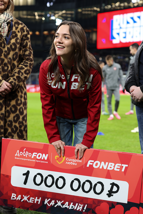Чек представителям фондов вручила чемпионка мира по фигурному катанию и амбассадор проекта FONTEAM Евгения Медведева перед началом товарищеского матча Россия - Сербия.