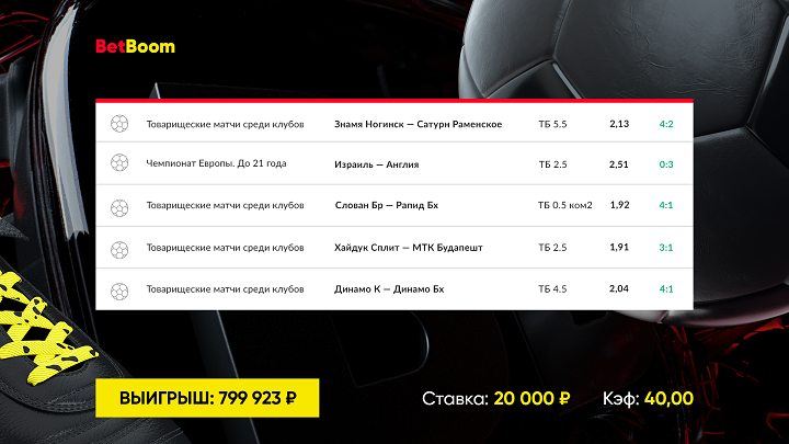 У одного из клиентов BetBoom выдалась удачная неделя — беттор получил 799 923 рублей, собрав футбольный экспресс из пяти матчей. В среду вечером он поставил 20 000 рублей на экспресс, совместив четыре общих тотала больше с одним индивидуальным. Сразу три коэффициента в экспрессе превысили 2.00, а общий составил 40.